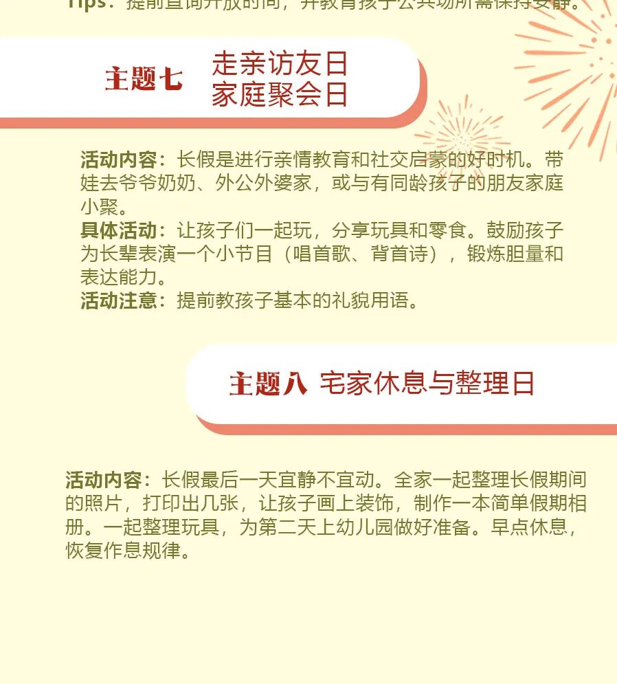 ·节后铺垫:长假最后两天,要有意识地恢复平时的作息时间,和孩子聊聊幼儿园的老师和好朋友,避免“节后入园焦虑”。